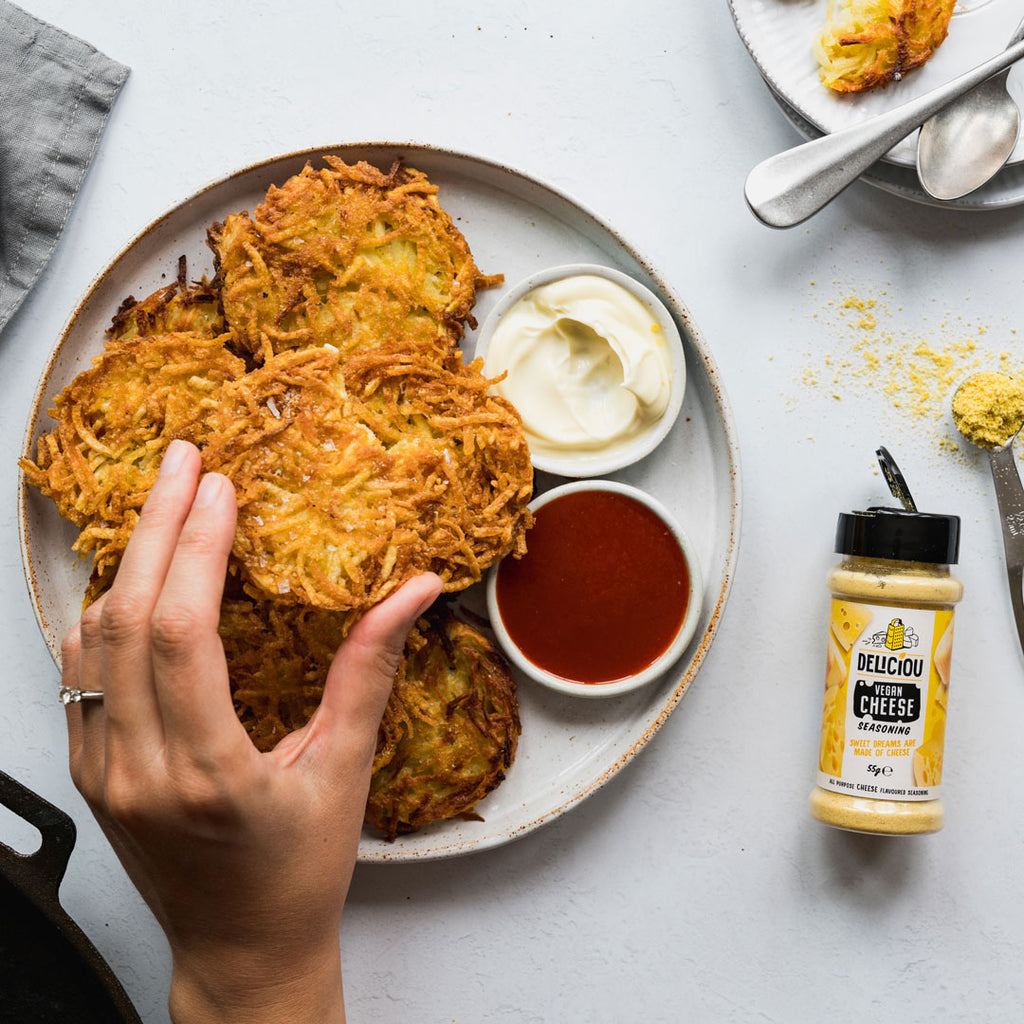 - Finally, squeeze the potatoes once more with the tea towel to get any remaining water out. Transfer to a bowl, add the cornflour, arrowroot, Deliciou Vegan Cheese seasoning and sprinkle some salt.
