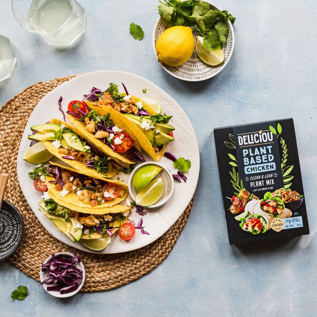 - Time to build your tacos! Spoon in some chicken, coleslaw mix, avocado and cherry tomatoes. Crumble over the vegan feta/cheese and finish with a squeeze of lime and some coriander. Enjoy!