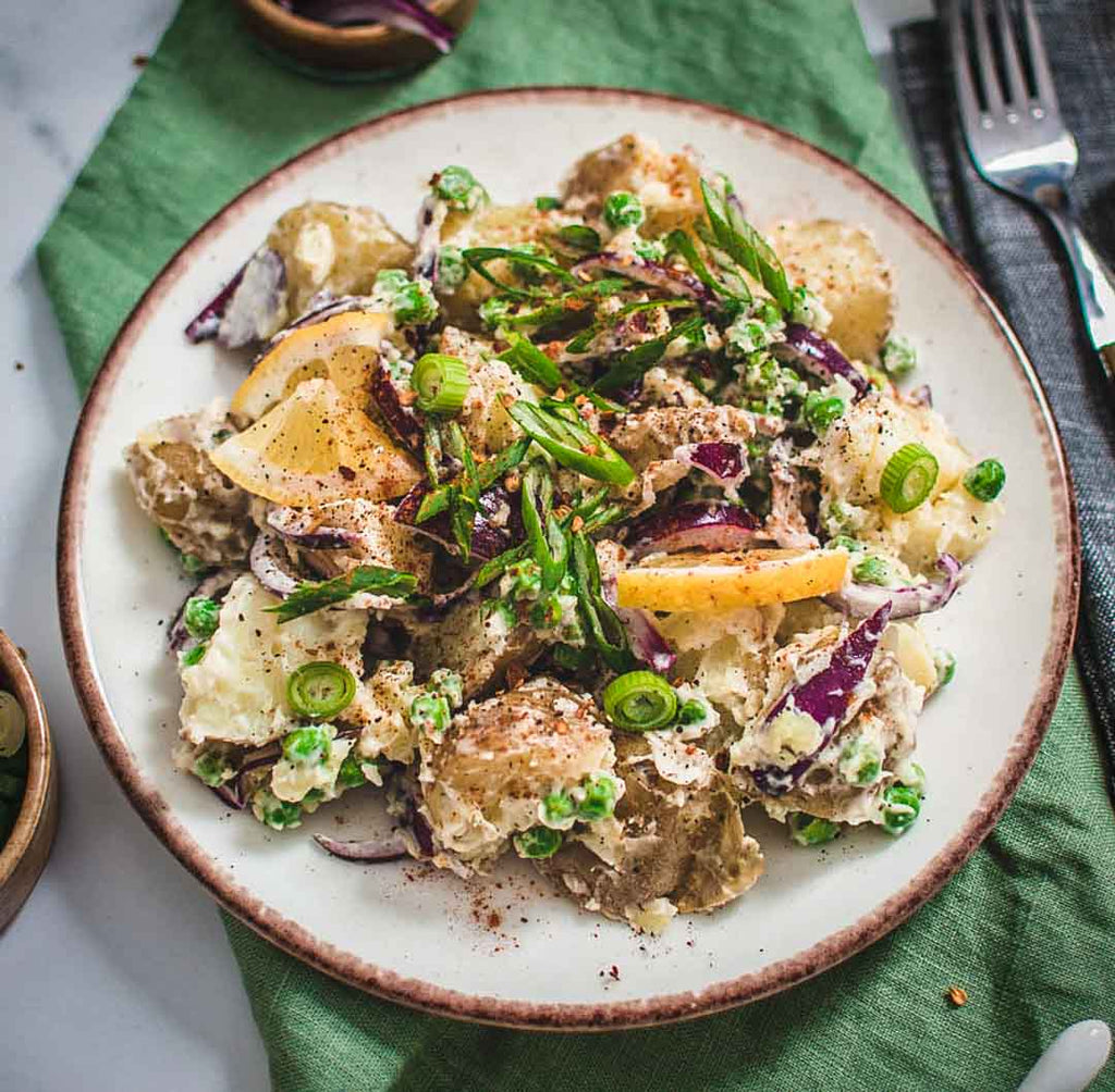 - Once cooled, combine the potatoes with the red onions and cooked peas. Pour the dressing over and mix gently until all ingredients are well coated.