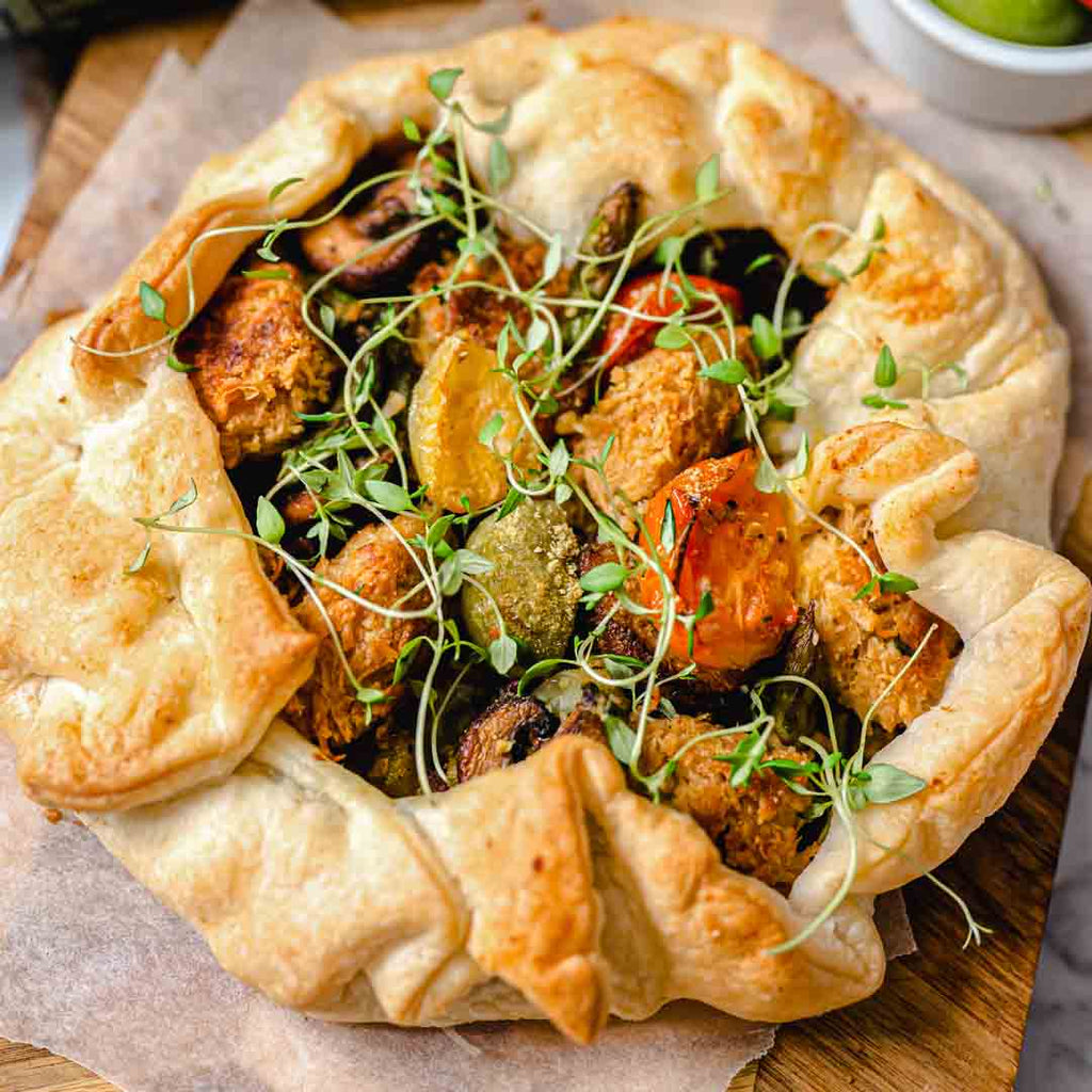 Going to a dinner party and want to impress? This rustic vegan chicken galette is just as beautiful as it is tasty! It’s full of vegetables, hearty and so easy to make! Present it on a wooden board and you’ve got a picture-worthy dish everyone will love.