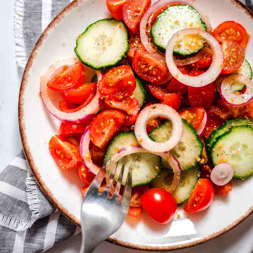 - In a large bowl, add the cucumbers, tomatoes and red onion. Pour over the dressing and then toss to combine. Serve immediately and enjoy!